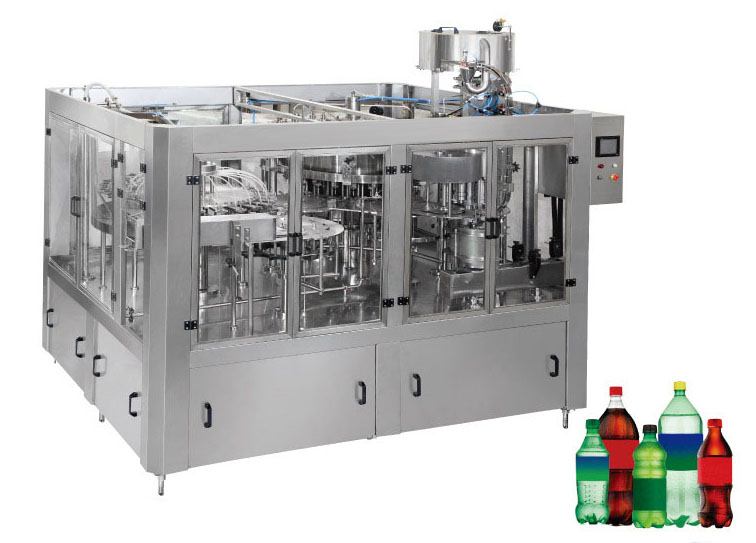 碳酸饮料设备与二氧化碳混合后的物料直接经管道打入碳酸饮料灌装机中的液缸,采用等压灌装原理进行定液位灌装。在碳酸饮料设备生产线中,瓶子由风道卡瓶口在风力作用下进入碳酸饮料灌装机(行业俗称三合一等压灌装机),依次对瓶子进行冲洗、灌装和封盖。封盖后的半成品由输送带输出,依次经过灯检(人工肉眼检测瓶子内部是否存在杂质,做好每一道安全防线)、温瓶机(用于将瓶内物料温度3℃升温到常温,否则遇热空气后,瓶壁会产生大量的露水,包装后会打湿包装箱)、吹干机(用于将瓶身上的水吹干)、喷码机(用于打上生产日期)、标签机(分为套标和贴标,根据瓶子而定)、包装机(分为膜包机和纸箱包装机,根据实际情况而定)。